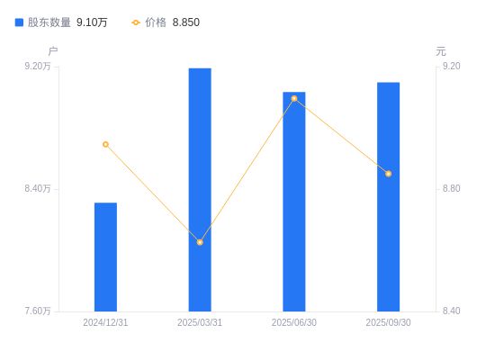 近一年(2024年9月30日至2025年9月30日),中国核建A股股东户数从8.86万户,增加至9.1万户,增幅2.62%,区间股价上涨16.51%。