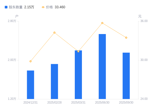 近一年(2024年9月30日至2025年9月30日),新兴装备A股股东户数从1.83万户,增加至2.15万户,增幅17.31%,区间股价上涨24.99%。