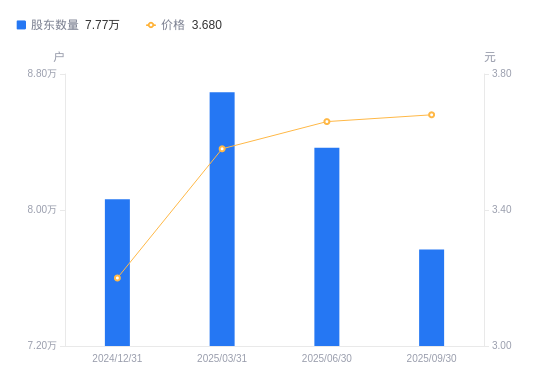 近一年(2024年9月30日至2025年9月30日),浙江永强A股股东户数从8.22万户,减低至7.77万户,降幅5.51%,区间股价上涨26.03%。