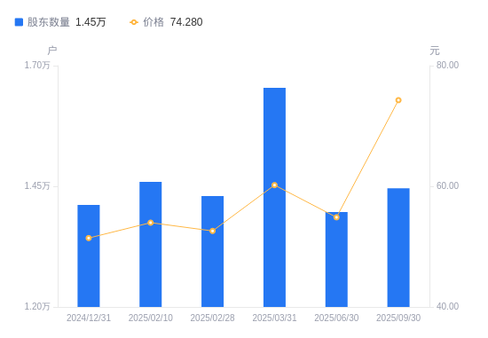 近一年(2024年9月30日至2025年9月30日),富创精密A股股东户数从1.07万户,增加至1.45万户,增幅34.51%,区间股价上涨94.69%。