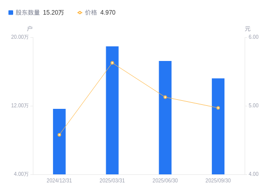 近一年(2024年9月30日至2025年9月30日),美年健康A股股东户数从12.34万户,增加至15.2万户,增幅23.16%,区间股价上涨26.56%。