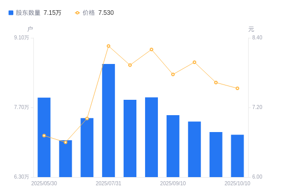 10月30日消息,数据显示,截至2025年9月30日,远望谷A股股东总户数为7.21万户,较上期(2025年9月19日)减少2113户,降幅2.85%。公司最新A股总股本为7.4亿股,其中流通A股7.05亿股,户均持有流通A股数量为9780.76股,较上期增加278.65股,增幅2.93%;户均持流通A股市值7.46万元,较上期减少1199.63元,降幅1.58%。