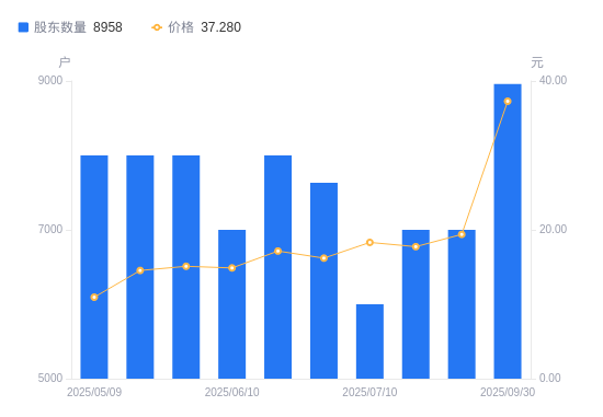 近一年(2024年9月30日至2025年9月30日),*ST宇顺A股股东户数从8977户,减低至8958户,降幅0.21%,区间股价上涨1047.08%。