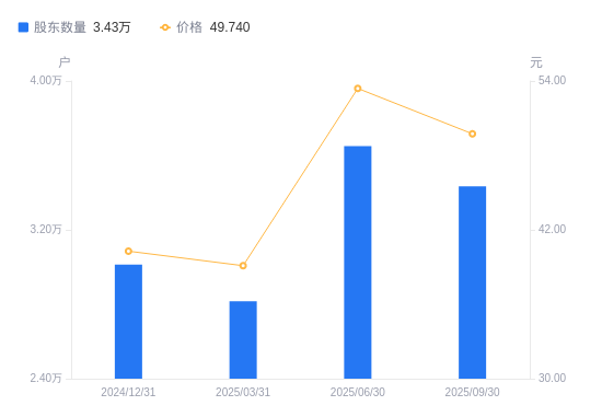 近一年(2024年9月30日至2025年9月30日),中无人机A股股东户数从2.42万户,增加至3.43万户,增幅41.75%,区间股价上涨48.26%。