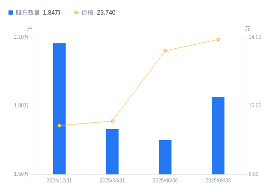 10月30日消息,数据显示,截至2025年9月30日,拉芳家化A股股东总户数为1.84万户,较上期(2025年6月30日)增加1878户,增幅11.38%。公司最新A股总股本为2.25亿股,其中流通A股2.25亿股,户均持有流通A股数量为1.23万股,较上期减少1394.09股,降幅10.22%;户均持流通A股市值29.08万元,较上期减少1.51万元,降幅4.93%。