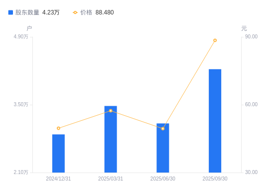 10月30日消息,数据显示,截至2025年9月30日,云天励飞A股股东总户数为4.23万户,较上期(2025年6月30日)增加1.12万户,增幅35.92%。公司最新A股总股本为3.59亿股,其中流通A股2.64亿股,户均持有流通A股数量为6231.52股,较上期减少2119.86股,降幅25.38%;户均持流通A股市值55.14万元,较上期增加13.86万元,增幅33.59%。