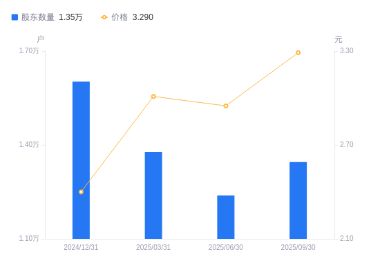 近一年(2024年9月30日至2025年9月30日),ST东时A股股东户数从1.97万户,减低至1.35万户,降幅31.76%,区间股价上涨126.90%。
