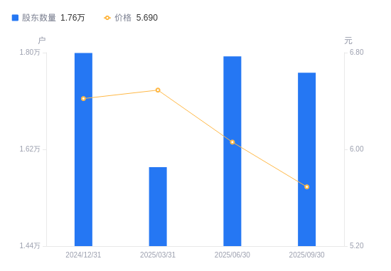 近一年(2024年9月30日至2025年9月30日),亚士创能A股股东户数从1.72万户,增加至1.76万户,增幅2.49%,区间股价下跌17.66%。