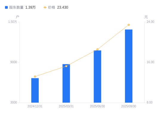 近一年(2024年9月30日至2025年9月30日),德马科技A股股东户数从7187户,增加至1.39万户,增幅93.02%,区间股价上涨154.29%。
