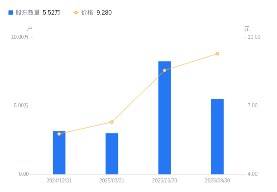 近一年(2024年9月30日至2025年9月30日),长城电工A股股东户数从3.87万户,增加至5.52万户,增幅42.77%,区间股价上涨71.22%。