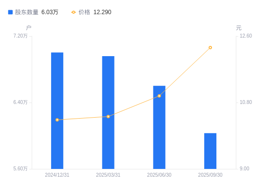 近一年(2024年9月30日至2025年9月30日),辽宁成大A股股东户数从6.76万户,减低至6.03万户,降幅10.78%,区间股价上涨16.94%。