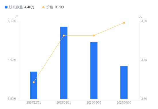 10月30日消息,数据显示,截至2025年9月30日,辽宁能源A股股东总户数为4.4万户,较上期(2025年6月30日)减少3735户,降幅7.82%。公司最新A股总股本为13.22亿股,其中流通A股13.21亿股,户均持有流通A股数量为3万股,较上期增加2344.97股,增幅8.48%;户均持流通A股市值11.37万元,较上期增加1.12万元,增幅10.88%。