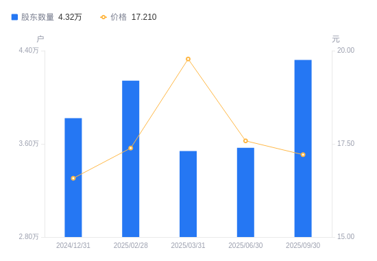 近一年(2024年9月30日至2025年9月30日),中国重汽A股股东户数从4.1万户,增加至4.32万户,增幅5.32%,区间股价上涨9.71%。