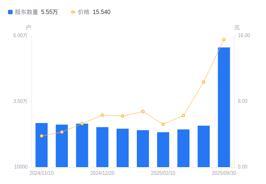 近一年(2024年9月30日至2025年9月30日),同洲电子A股股东户数从2.81万户,增加至5.55万户,增幅97.83%,区间股价上涨726.60%。
