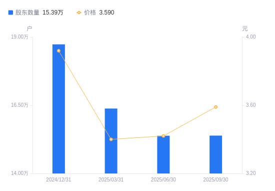 近一年(2024年9月30日至2025年9月30日),中化岩土A股股东户数从6.62万户,增加至15.39万户,增幅132.52%,区间股价上涨103.98%。