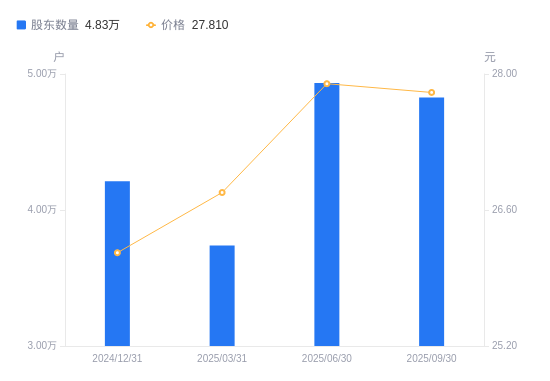 10月30日消息,数据显示,截至2025年9月30日,姚记科技A股股东总户数为4.83万户,较上期(2025年6月30日)减少1072户,降幅2.17%。公司最新A股总股本为4.18亿股,其中流通A股3.37亿股,户均持有流通A股数量为6985.79股,较上期增加154.93股,增幅2.27%;户均持流通A股市值19.43万元,较上期增加3693.92元,增幅1.94%。