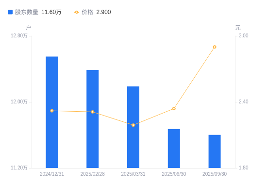 10月30日消息,数据显示,截至2025年9月30日,和辉光电A股股东总户数为11.6万户,较上期(2025年6月30日)减少707户,降幅0.61%。公司最新A股总股本为138.09亿股,其中流通A股57.52亿股,户均持有流通A股数量为4.96万股,较上期增加300.3股,增幅0.61%;户均持流通A股市值14.38万元,较上期增加2.85万元,增幅24.69%。