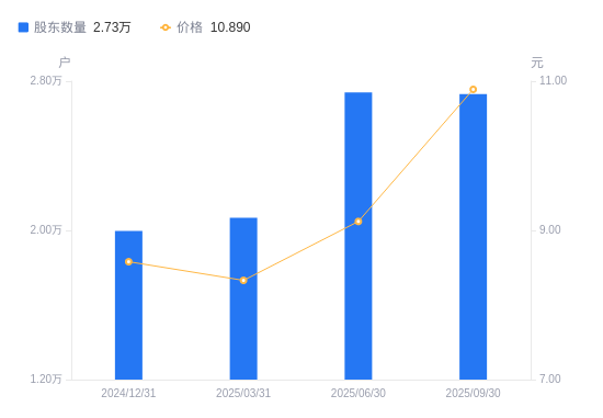 近一年(2024年9月30日至2025年9月30日),中谷物流A股股东户数从2.05万户,增加至2.73万户,增幅33.49%,区间股价上涨50.41%。