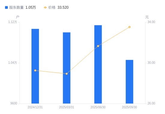 近一年(2024年9月30日至2025年9月30日),中科微至A股股东户数从1.21万户,减低至1.05万户,降幅13.49%,区间股价上涨20.92%。