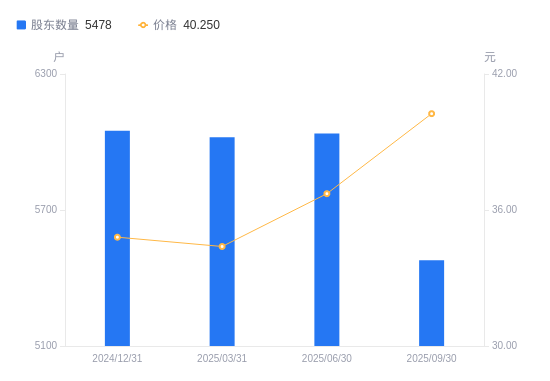 近一年(2024年9月30日至2025年9月30日),扬州金泉A股股东户数从6833户,减低至5478户,降幅19.83%,区间股价上涨40.20%。