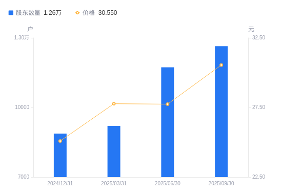 10月30日消息,数据显示,截至2025年9月30日,智翔金泰A股股东总户数为1.26万户,较上期(2025年6月30日)增加909户,增幅7.75%。公司最新A股总股本为3.67亿股,其中流通A股1.17亿股,户均持有流通A股数量为9231.01股,较上期减少715.28股,降幅7.19%;户均持流通A股市值28.2万元,较上期增加6097.18元,增幅2.21%。