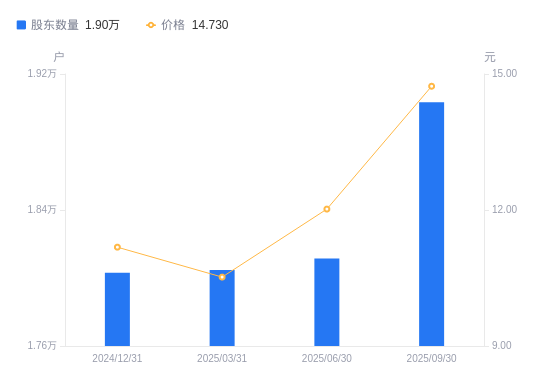 近一年(2024年9月30日至2025年9月30日),瑞泰科技A股股东户数从2.2万户,减低至1.9万户,降幅13.37%,区间股价上涨66.82%。