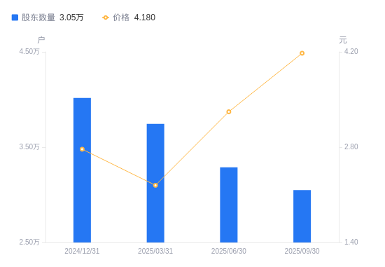 近一年(2024年9月30日至2025年9月30日),*ST惠程A股股东户数从5.33万户,减低至3.05万户,降幅42.83%,区间股价上涨91.74%。