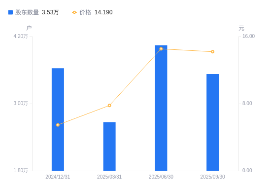10月30日消息,数据显示,截至2025年9月30日,潮宏基A股股东总户数为3.53万户,较上期(2025年6月30日)减少5134户,降幅12.70%。公司最新A股总股本为8.89亿股,其中流通A股8.67亿股,户均持有流通A股数量为2.46万股,较上期增加3118.77股,增幅14.54%;户均持流通A股市值34.86万元,较上期增加3.7万元,增幅11.86%。