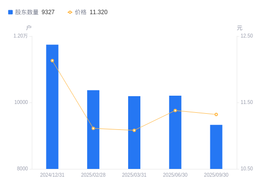 近一年(2024年9月30日至2025年9月30日),金三江A股股东户数从9110户,增加至9327户,增幅2.38%,区间股价上涨29.65%。