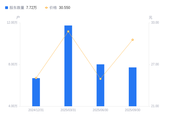 近一年(2024年9月30日至2025年9月30日),至纯科技A股股东户数从5.73万户,增加至7.72万户,增幅34.77%,区间股价上涨49.75%。