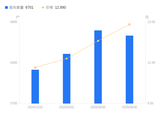 近一年(2024年9月30日至2025年9月30日),卓然股份A股股东户数从5689户,增加至6701户,增幅17.79%,区间股价上涨14.48%。