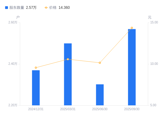 近一年(2024年9月30日至2025年9月30日),森特股份A股股东户数从2.23万户,增加至2.57万户,增幅15.21%,区间股价上涨67.37%。