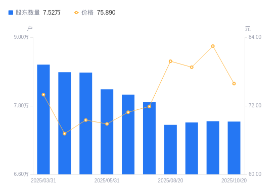 近一年(2024年11月20日至2025年10月20日),汇顶科技A股股东户数从8.66万户,减低至7.52万户,降幅13.09%,区间股价下跌9.69%。
