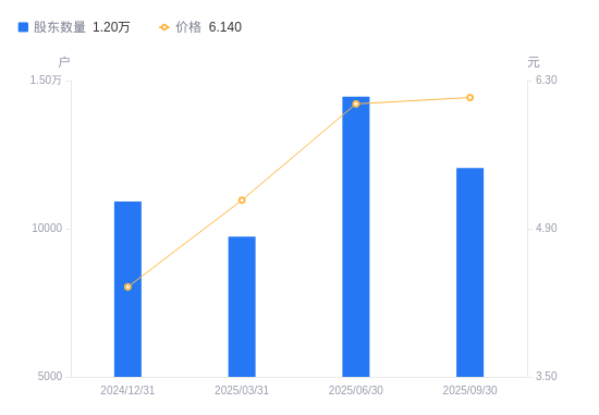 近一年(2024年9月30日至2025年9月30日),南卫股份A股股东户数从1.1万户,增加至1.2万户,增幅9.93%,区间股价上涨59.90%。