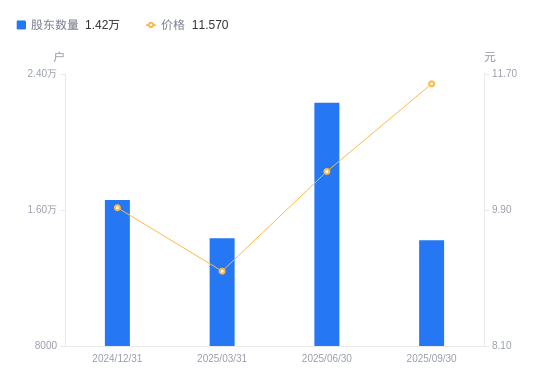 10月30日消息,数据显示,截至2025年9月30日,空港股份A股股东总户数为1.42万户,较上期(2025年6月30日)减少8088户,降幅36.26%。公司最新A股总股本为3亿股,其中流通A股3亿股,户均持有流通A股数量为2.11万股,较上期增加7651.6股,增幅56.89%;户均持流通A股市值24.41万元,较上期增加10.41万元,增幅74.37%。