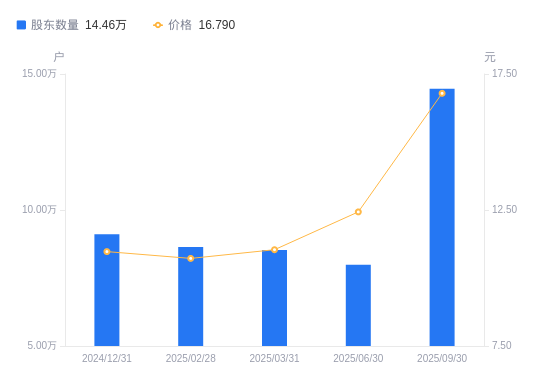 近一年(2024年9月30日至2025年9月30日),航天科技A股股东户数从10.71万户,增加至14.46万户,增幅35.05%,区间股价上涨61.13%。