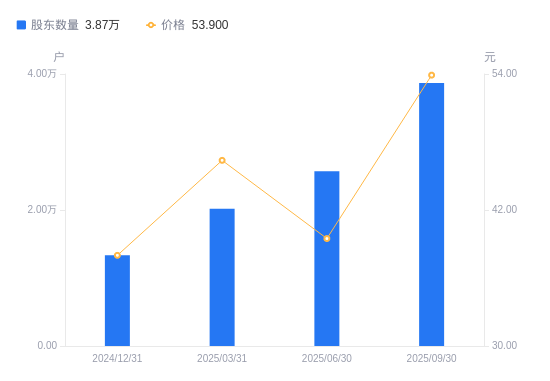 近一年(2024年9月30日至2025年9月30日),超讯通信A股股东户数从2.02万户,增加至3.87万户,增幅91.87%,区间股价上涨97.44%。