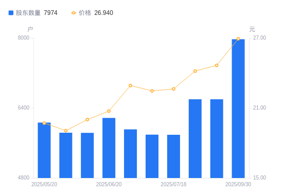 近一年(2024年9月30日至2025年9月30日),气派科技A股股东户数从7099户,增加至7974户,增幅12.33%,区间股价上涨59.41%。