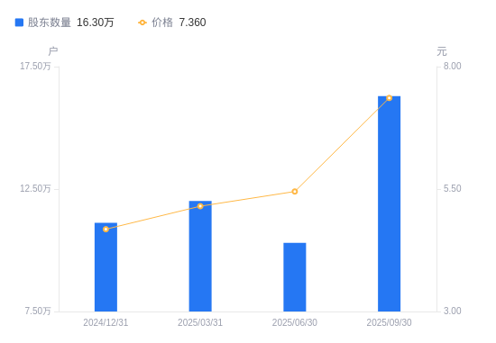 10月30日消息,数据显示,截至2025年9月30日,佳都科技A股股东总户数为16.3万户,较上期(2025年6月30日)增加6万户,增幅58.23%。公司最新A股总股本为21.33亿股,其中流通A股21.33亿股,户均持有流通A股数量为1.31万股,较上期减少7619.12股,降幅36.80%;户均持流通A股市值9.63万元,较上期减少1.65万元,降幅14.65%。