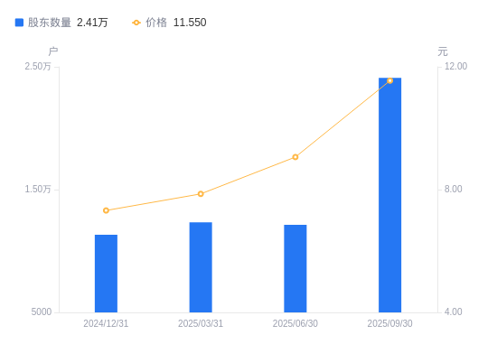 近一年(2024年9月30日至2025年9月30日),德创环保A股股东户数从1.17万户,增加至2.41万户,增幅105.53%,区间股价上涨52.98%。