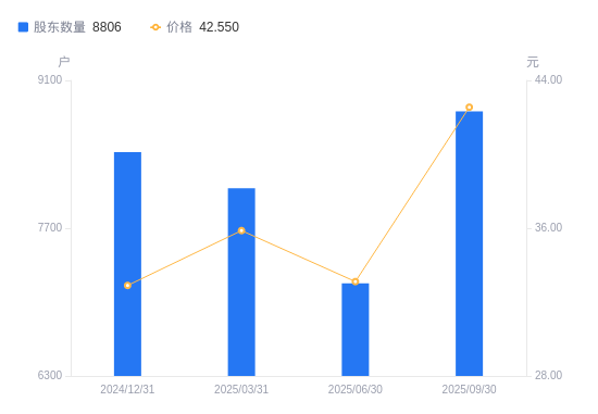 近一年(2024年9月30日至2025年9月30日),华达科技A股股东户数从7323户,增加至8806户,增幅20.25%,区间股价上涨38.60%。