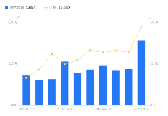 近一年(2024年9月30日至2025年9月30日),炬申股份A股股东户数从8572户,增加至1.65万户,增幅92.90%,区间股价上涨69.17%。