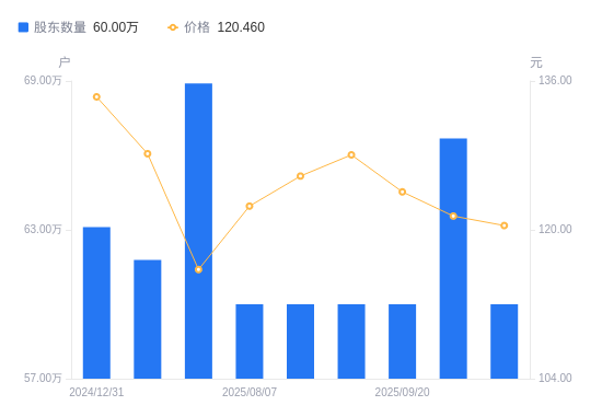 近一年(2024年12月31日至2025年10月20日),五粮液A股股东户数从63.11万户,减低至60万户,降幅4.93%,区间股价下跌11.08%。