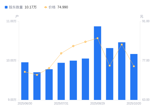 近一年(2024年10月31日至2025年10月20日),景嘉微A股股东户数从8.98万户,增加至10.17万户,增幅13.28%,区间股价下跌15.72%。