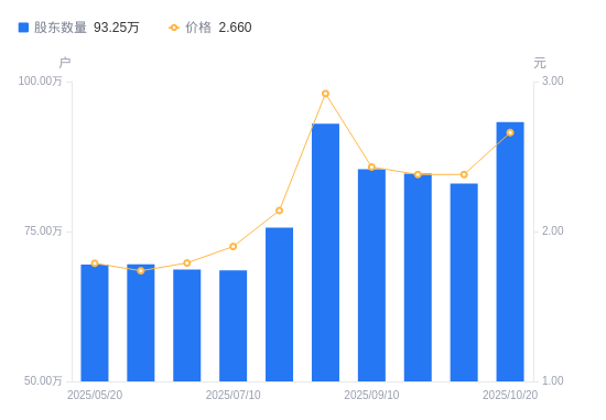近一年(2024年11月8日至2025年10月20日),包钢股份A股股东户数从83.86万户,增加至93.25万户,增幅11.21%,区间股价上涨25.00%。