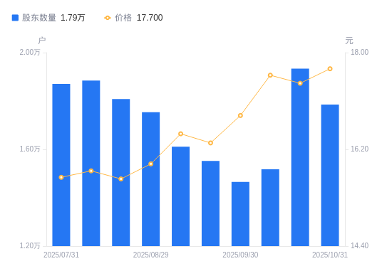 近一年(2024年10月31日至2025年10月31日),黔源电力A股股东户数从1.72万户,增加至1.79万户,增幅3.56%,区间股价上涨16.75%。