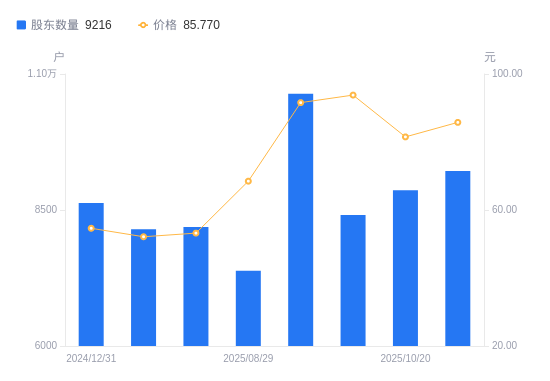 近一年(2024年12月31日至2025年10月31日),骏鼎达A股股东户数从8629户,增加至9216户,增幅6.80%,区间股价上涨49.72%。