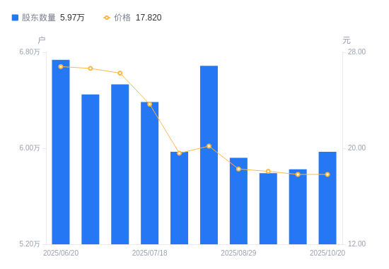 近一年(2024年10月31日至2025年10月20日),永安药业A股股东户数从2.51万户,增加至5.97万户,增幅138.21%,区间股价上涨125.80%。