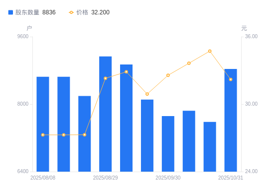 近一年(2024年11月20日至2025年10月31日),洁雅股份A股股东户数从7665户,增加至8836户,增幅15.28%,区间股价上涨56.36%。