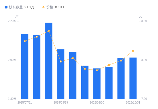 近一年(2024年10月31日至2025年10月31日),益盛药业A股股东户数从2.18万户,减低至2.01万户,降幅7.57%,区间股价上涨20.62%。